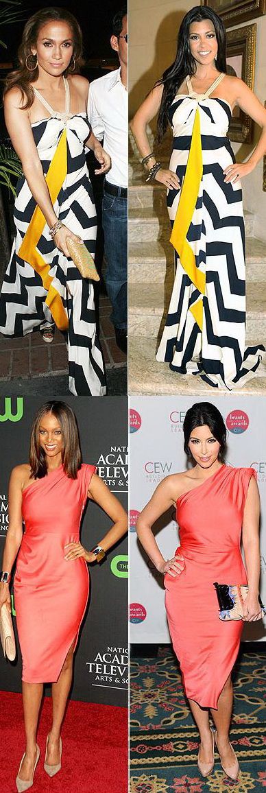 Tyra Banks - Kim Kardashian – Daca Tyra a ales o rochie creata de Rachel Roy pentru a o purta in septembrie 2009, in timpul zilei, la Premiile Emmy, acelasi model l-a ales si Kim Kardashian, pentru un eveniment organizat de o firma de cosmetice. In cazul lor, pana si pantofii au fost aceasi culoare si acelasi model.